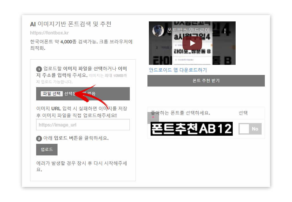 한글 폰트를 찾을 때, 굉장히 만족스럽게 사용하고 있는 사이트입니다 정확도도 높고 인식률이 높습니다 검색해보고 싶은 폰트를 직접 캡처해서 이미지 형태로 업로드하면 됩니다 결과는 오른쪽 아래 "폰트 추천"밑으로 목록이 뜹니다