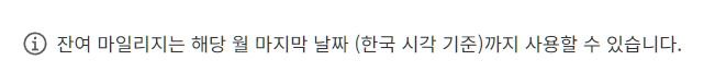 잔여 마일리지의 유효기간은 "해당 월 마지막 날짜"까지 가능하다고 한다. 이는 한국 시간을 기준으로 하기 때문에 해외에서 사용할 예정이라면 한국과의 시차를 고려하여 티켓을 발권해야 한다.