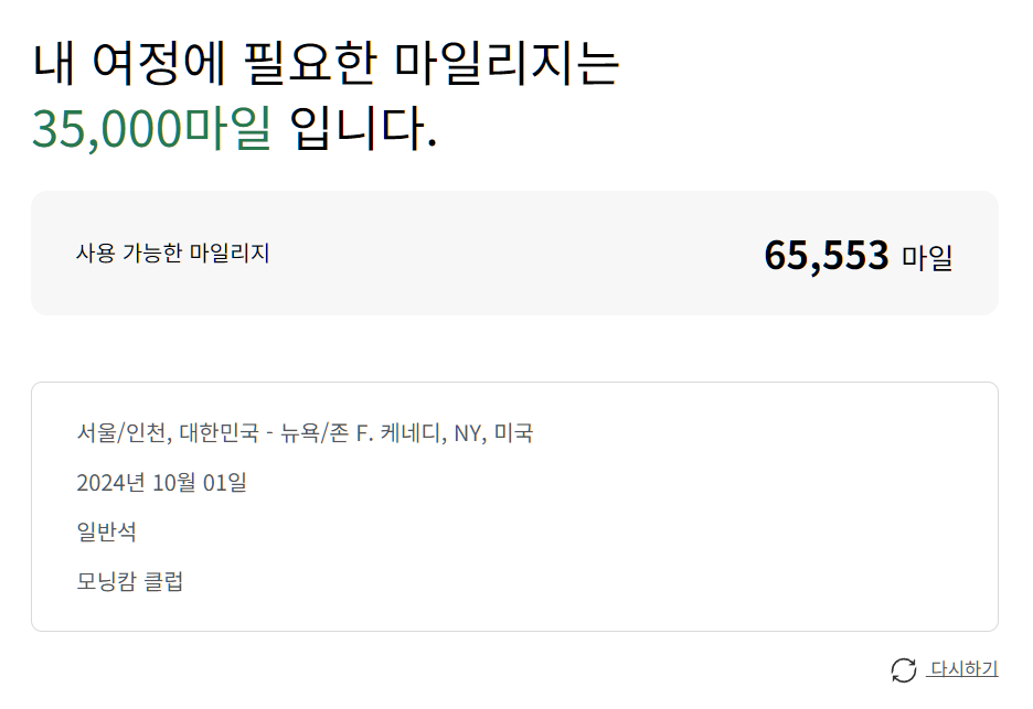 한국에서 뉴욕으로 가는 일반석을 마일리지로 예매할 경우에 약 35,000마일리지가 필요하다. 1마일리지 = 15원이라는 공식으로는 맞지 않는 가격이지만 정확하게 마일리지의 가치를 측정하기 어렵기 때문에 최대한 보수적으로 계산한 수치이다. 뉴욕 및 미국까지 가는 비행기는 3-4만 마일리지가 소모된다.