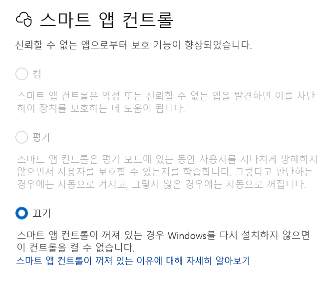 설정 - 개인 정보 및 보안 - Windows 보안 - 앱 및 브라우저 컨트롤 - 스마트 앱 컨트롤 설정 - 끄기